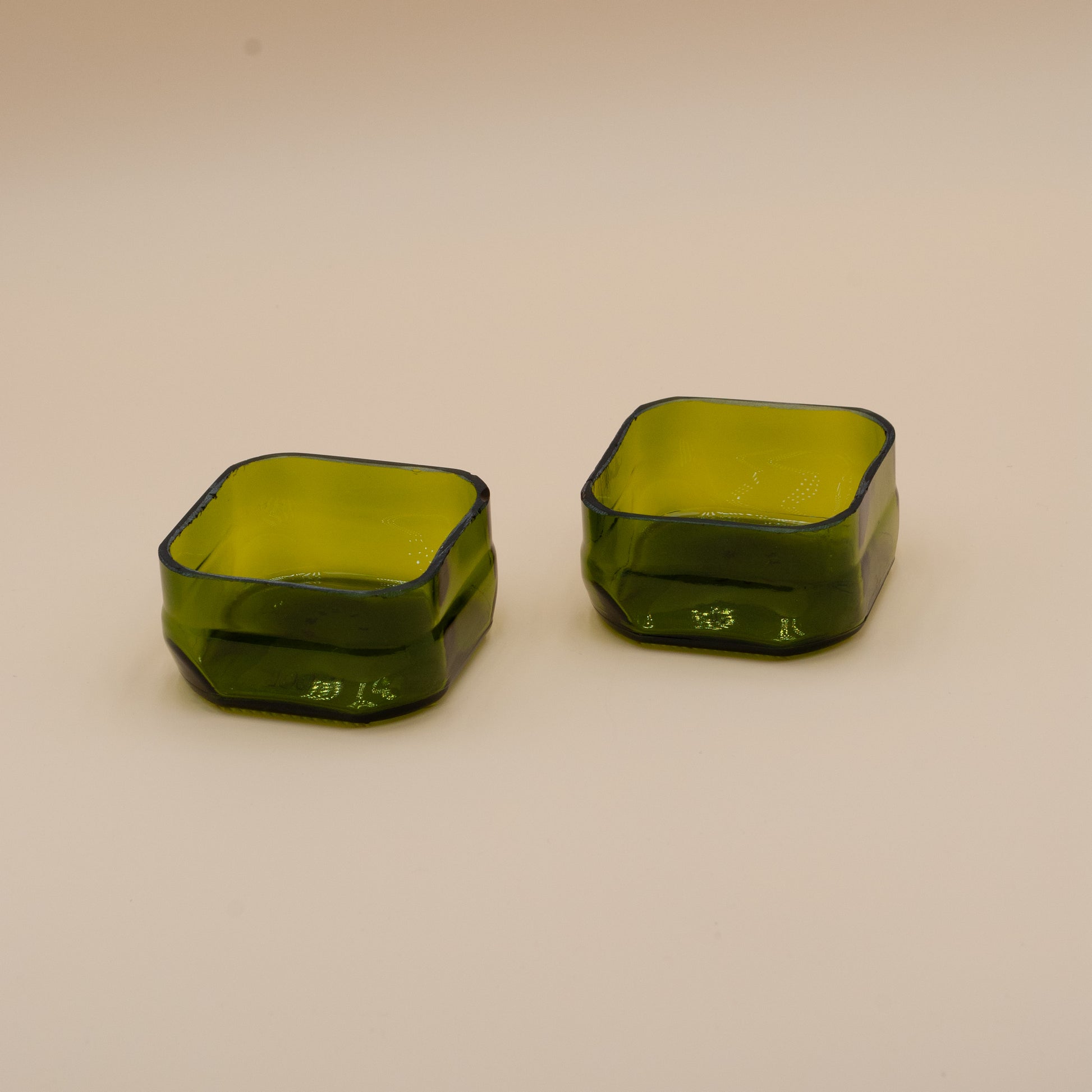 Deze set upcycled snackkommen is koud bewerkt in onze studio van hergebruikte olijfolie flessen. Elke kom is uniek gevormd en afgewerkt, en biedt een stijlvolle manier om uw favoriete snacks, olijven, noten of tapas te serveren.