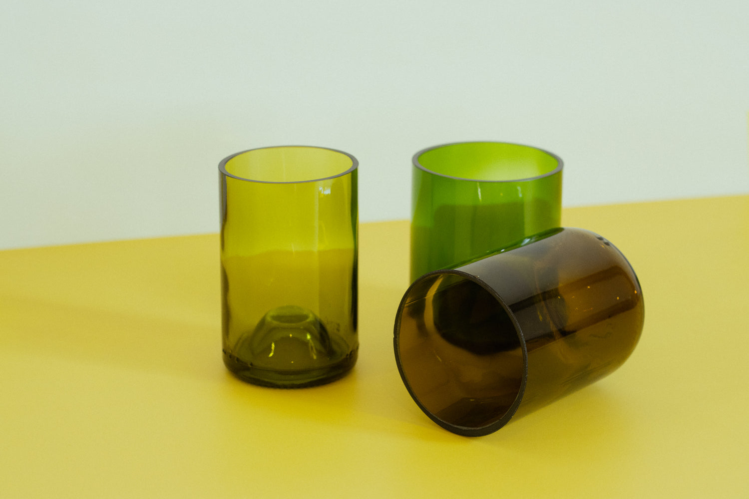 Deze glazen waren ooit wijnflessen, maar zijn nu met de hand vervaardigd en gerecycled tot prachtige glazen. Deze stukken maken deel uit van onze reguliere collectie, die bestaat uit een reeks eenvoudige maar unieke koudbewerkte stukken.