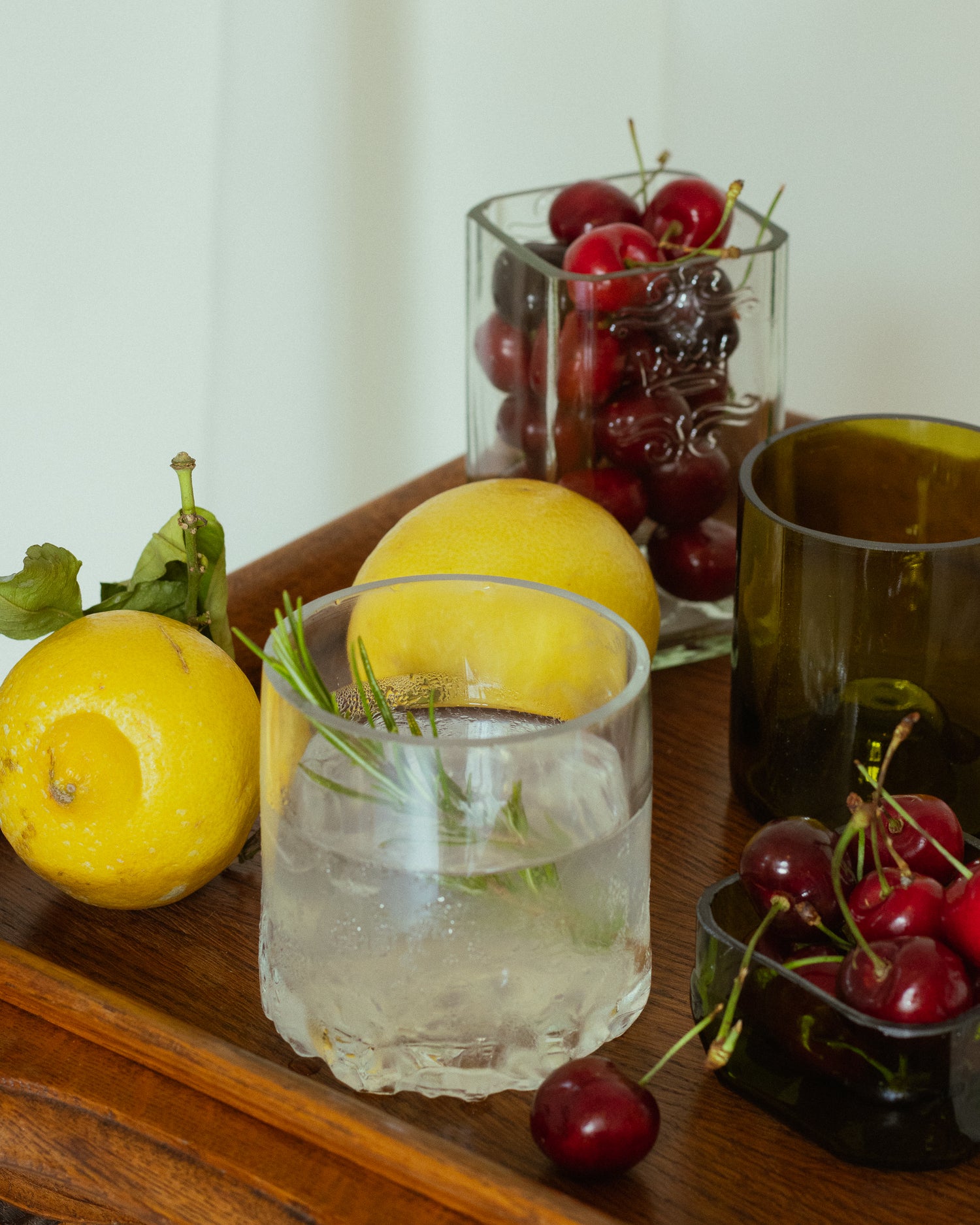 Oorspronkelijk een fles rosé gedeeld met vrienden, momenten van lachen en verbinding vastleggend. Vandaag de dag is deze fles getransformeerd tot een prachtige set handgemaakte glazen, koud bewerkt in onze studio om unieke stukken te bieden.